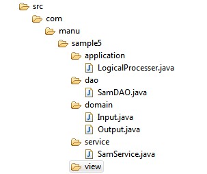 I have skipped the view layer here as it not so relevent. We are expecting the INPUT from the UI in a bean Input and thats that we willl have in the service layer. Here, With this few line of coding, you can acheive the full functionality of the application from the service layer.